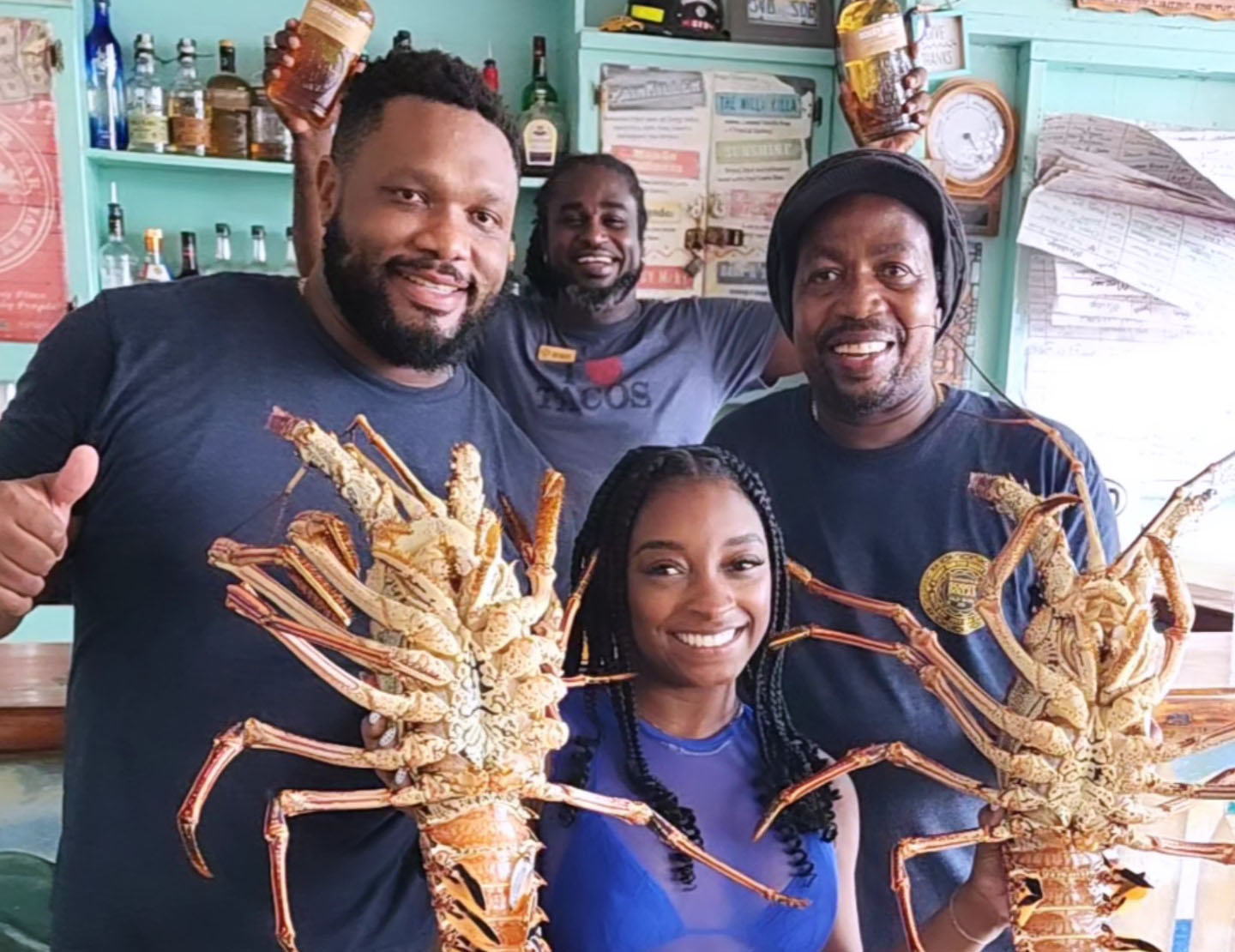 Another image shows Biles Owens, an American gymnast with 11 Olympic medals and 30 World Championship medals, holding two sizable spiny lobsters while surrounded by visibly excited staff members.