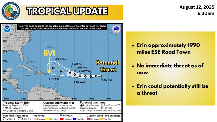 “Erin is far away, but storms can change direction. Stay informed, stay ready, and stay safe,” the BVIDDM said in a public advisory.