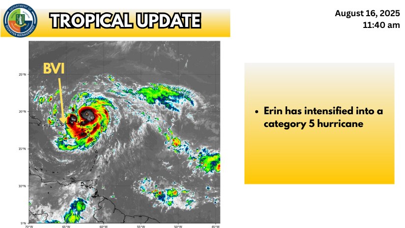 Hurricane Erin, a Category 5 storm, has moved out of the monitored area of the Leeward Islands and the British Virgin Islands, according to the Antigua and Barbuda Meteorological Services in a statement issued at 9:02 a.m. Eastern Caribbean Time Saturday, Aug. 16. While tropical storm watches and alerts have been discontinued, the territory continues to experience occasional showers and gusty winds, particularly in Anegada and elevated areas across the islands, the Department of Disaster Management (DDM) reported in an update at 11:40 a.m.