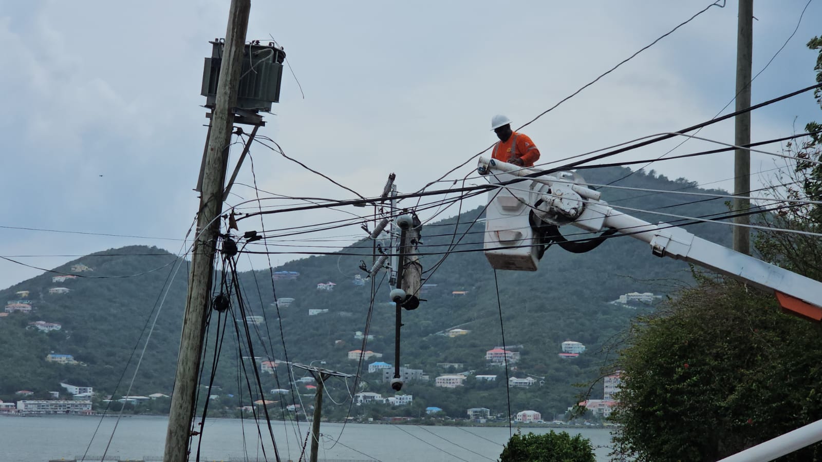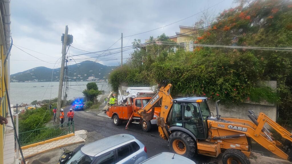 Emergency crews from the BVI Electricity Corporation and Fire and Rescue Service responded to the scene to extinguish the fire, secure the pole, and repair electrical lines.