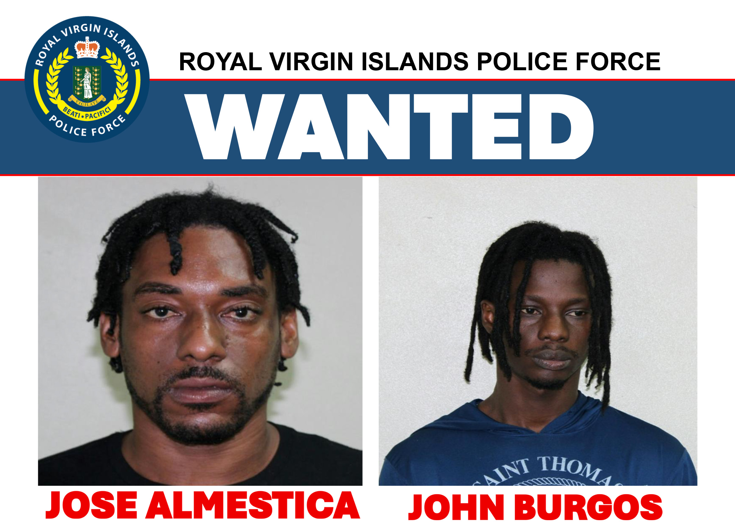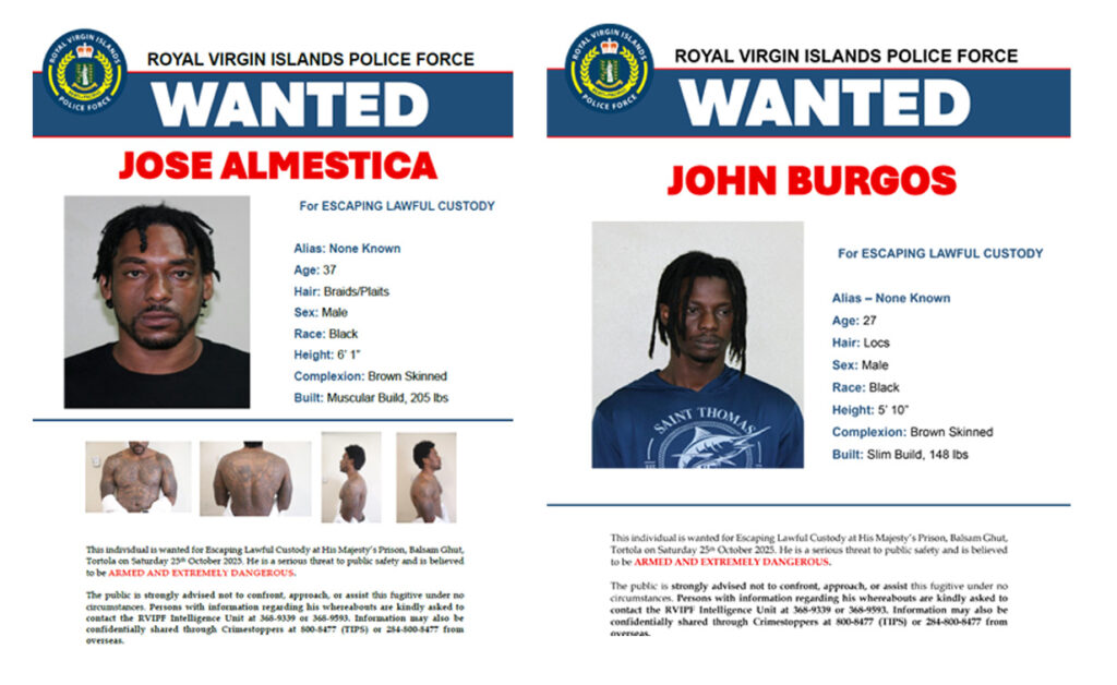 The Royal Virgin Islands Police Force (RVIPF) has issued wanted notices for Jose Almestica and John Burgos, two inmates who escaped from His Majesty’s Prison at Balsam Ghut on Oct. 25. Both men are citizens of the United States Virgin Islands and are considered armed and extremely dangerous, police said.
