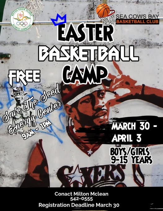 The Sea Cow’s Bay Basketball Club and the BVI Olympic Committee will host a free Easter Basketball Camp for boys and girls ages 9 to 15 at the Save the Seed Energy Center from March 30 to April 3, 2026.