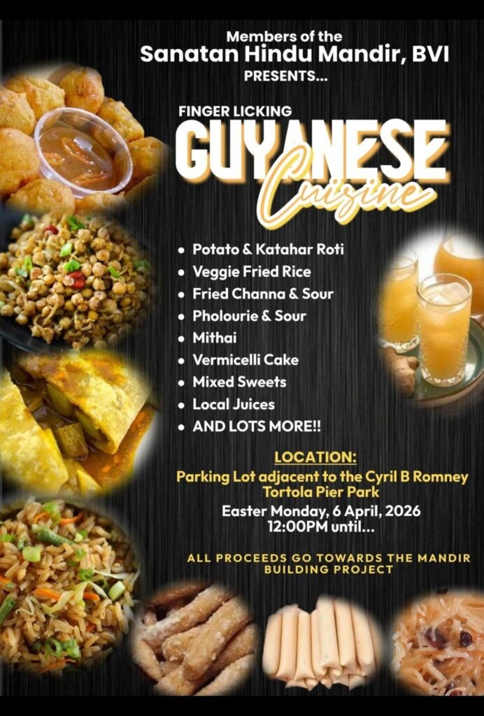 The Sanatan Hindu Mandir, BVI, will be hosting a Guyanese cuisine fundraiser at the parking lot adjacent to the Cyril B. Romney Tortola Pier Park, also beginning at 12 p.m. Easter Monday. The event is organized to support the mandir’s building project, with proceeds directed toward ongoing development efforts.