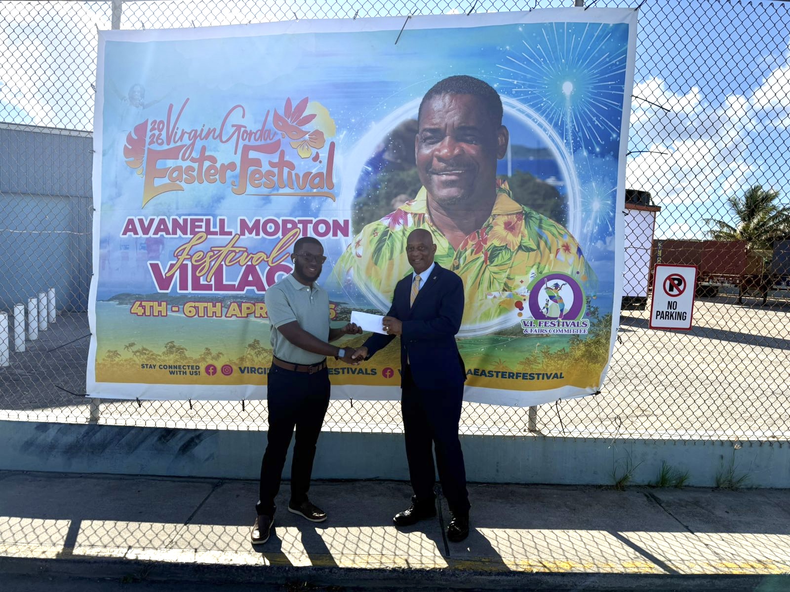 Hon. Vincent Wheatley, District 9 Representative, presented his annual financial contribution on April 1 to the Virgin Gorda Easter Festival Committee, led by Sub-committee Chair Reshawn Stevens, in support of the upcoming Virgin Gorda Easter Festival and its continued role in preserving community traditions.