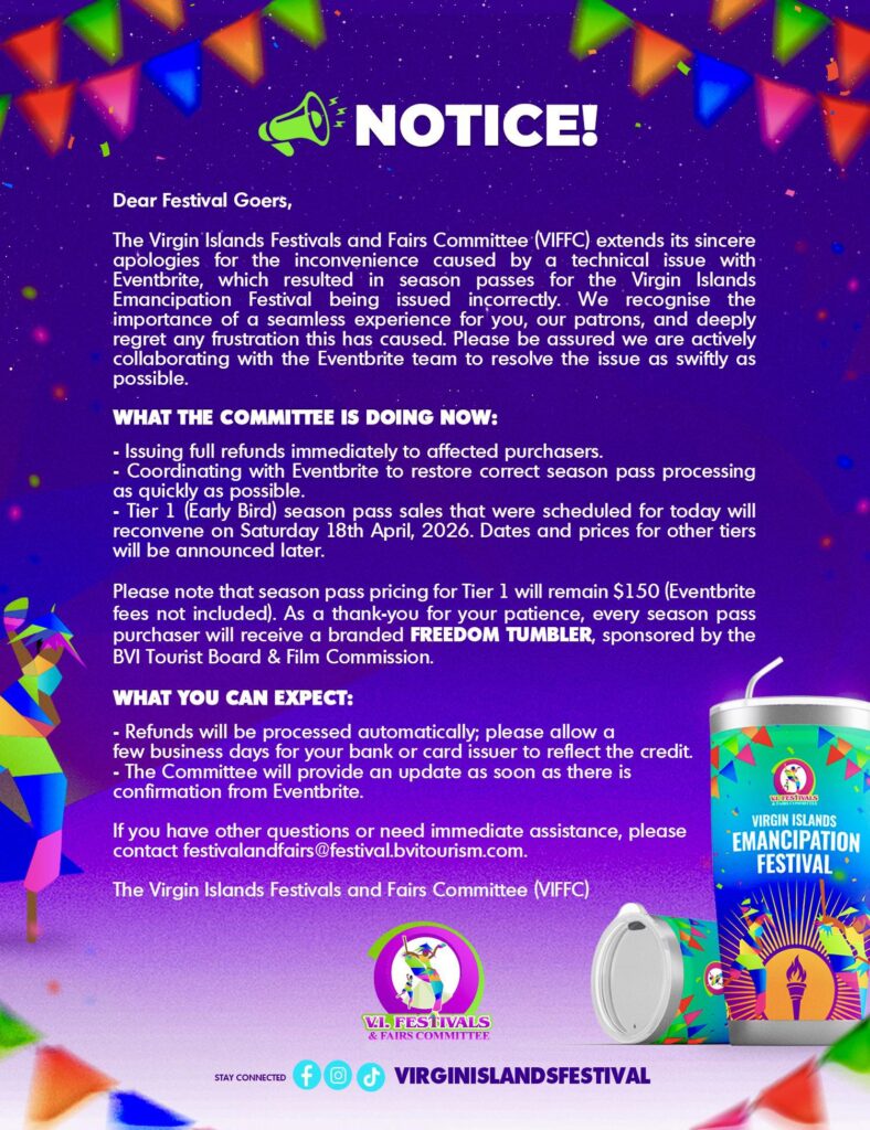 The Virgin Islands Festivals and Fairs Committee (VIFFC) said a technical issue with Eventbrite led to the incorrect issuance of season passes for the Virgin Islands Emancipation Festival, prompting immediate refunds and a rescheduling of sales.