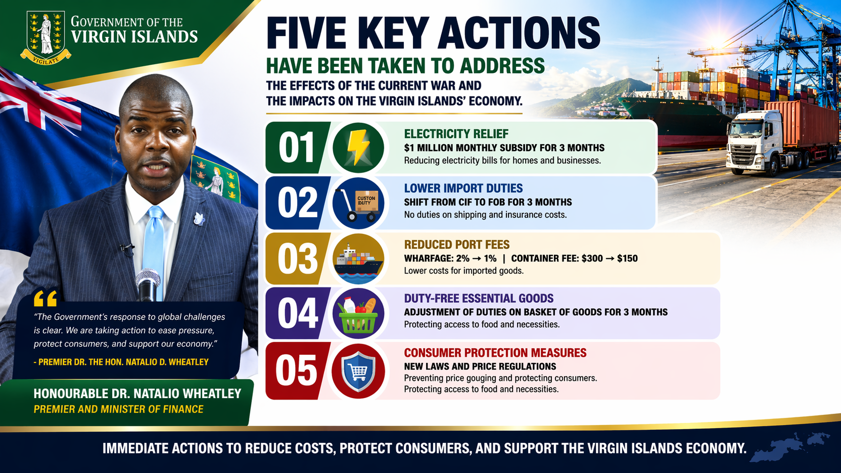 Premier Dr. the Hon. Natalio D. Wheatley announced that the Government of the Virgin Islands will temporarily reduce port-related fees as part of a broader effort to ease rising costs for businesses and consumers amid global economic pressures.
