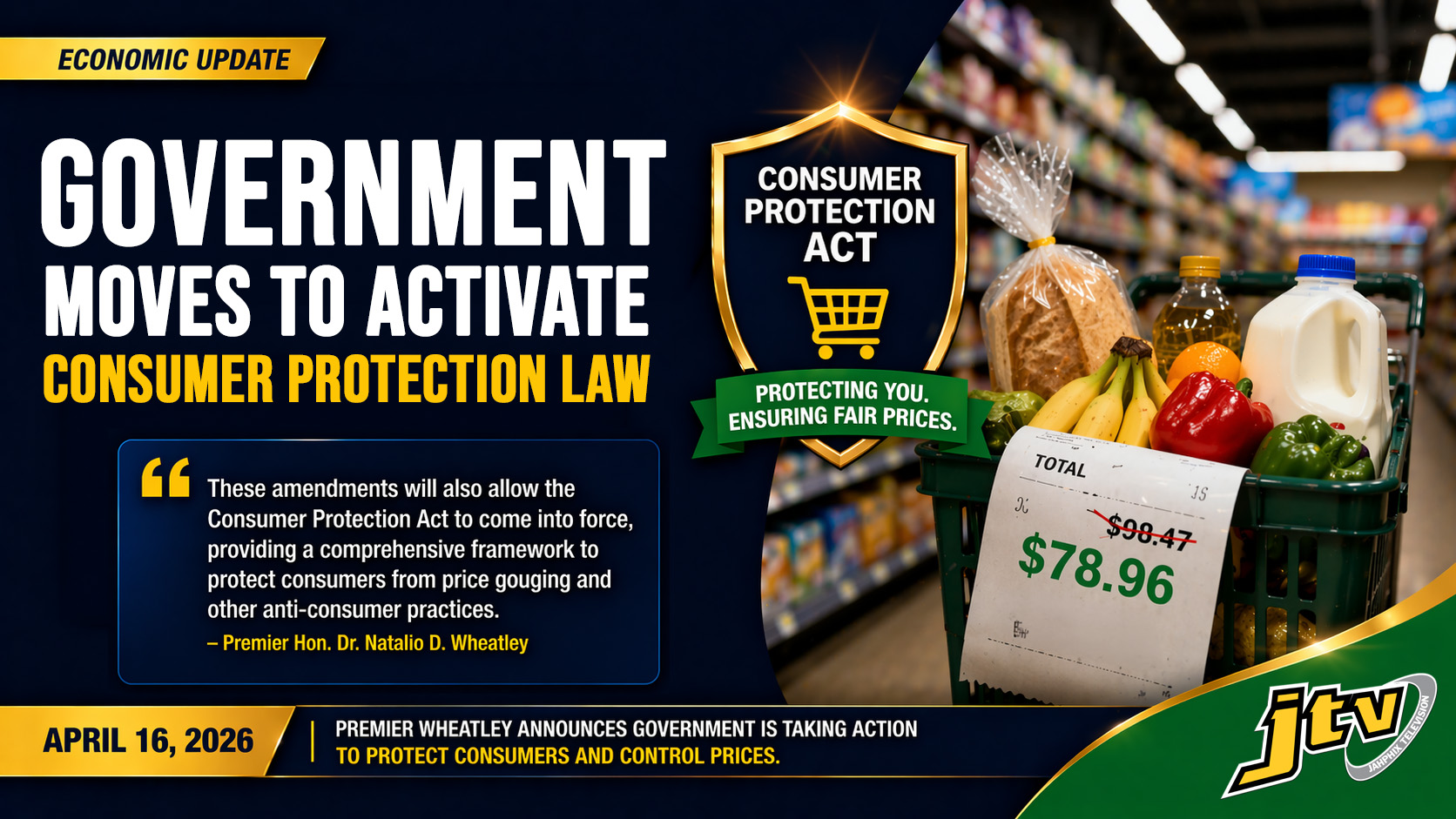 Premier Dr. Hon. Natalio D. Wheatley announced during a national address on April 16 that legislative amendments are being prepared to bring the Consumer Protection Act into force, alongside new regulations aimed at monitoring and controlling prices on essential goods.