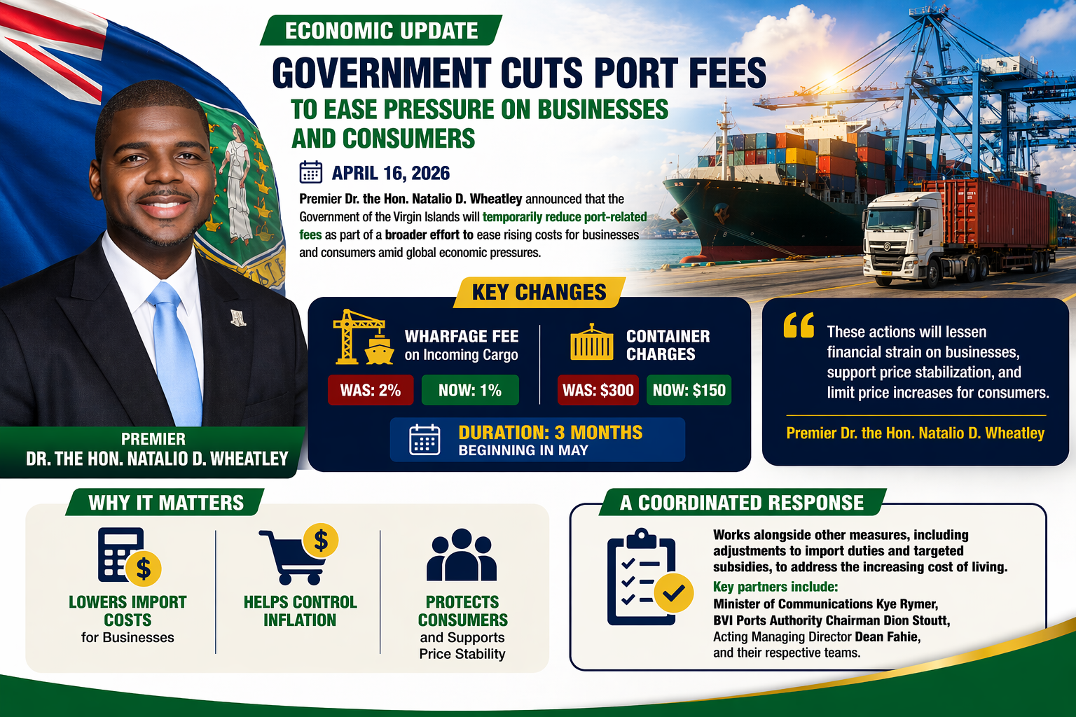Premier Dr. the Hon. Natalio D. Wheatley announced that the Government of the Virgin Islands will temporarily reduce port-related fees as part of a broader effort to ease rising costs for businesses and consumers amid global economic pressures.