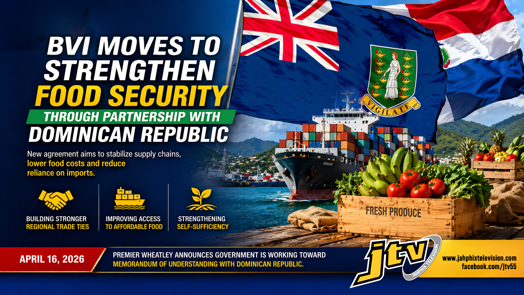 Premier Hon. Dr. Natalio D. Wheatley announced during a national address on April 16 that the government is working toward a memorandum of understanding with the Dominican Republic aimed at stabilizing supply chains and ensuring more affordable access to food.