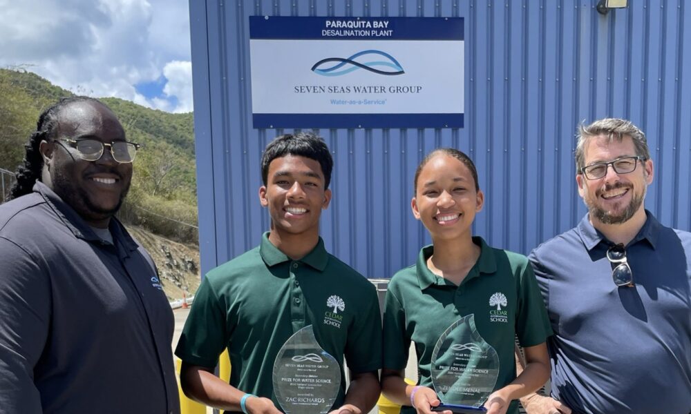 Zac Richards and Zendée Menal of Cedar International School and Daundre Rhodes of Bregado Flax Educational Centre were recognized by Seven Seas Water Group with the...