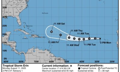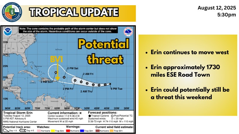 As of 5 PM today, Tropical Storm Erin remains a significant weather system located approximately 1,730 miles east-southeast of the Virgin Islands. The storm is moving...