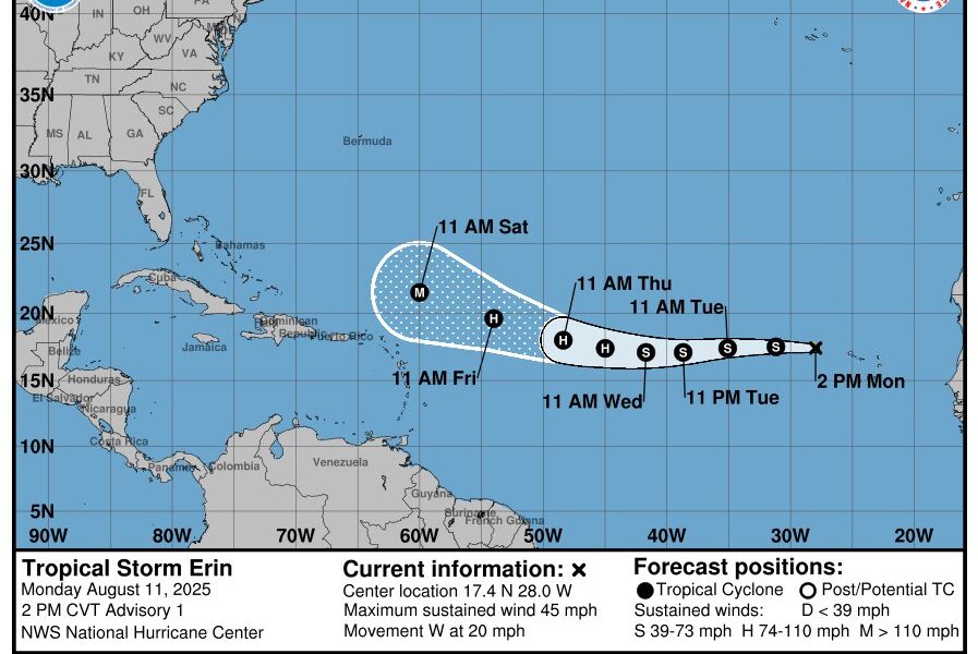 Tropical Storm Erin formed Monday morning in the central Atlantic, approximately 2,400 miles east-southeast of the Virgin Islands, according to the National Hurricane Center. The system...